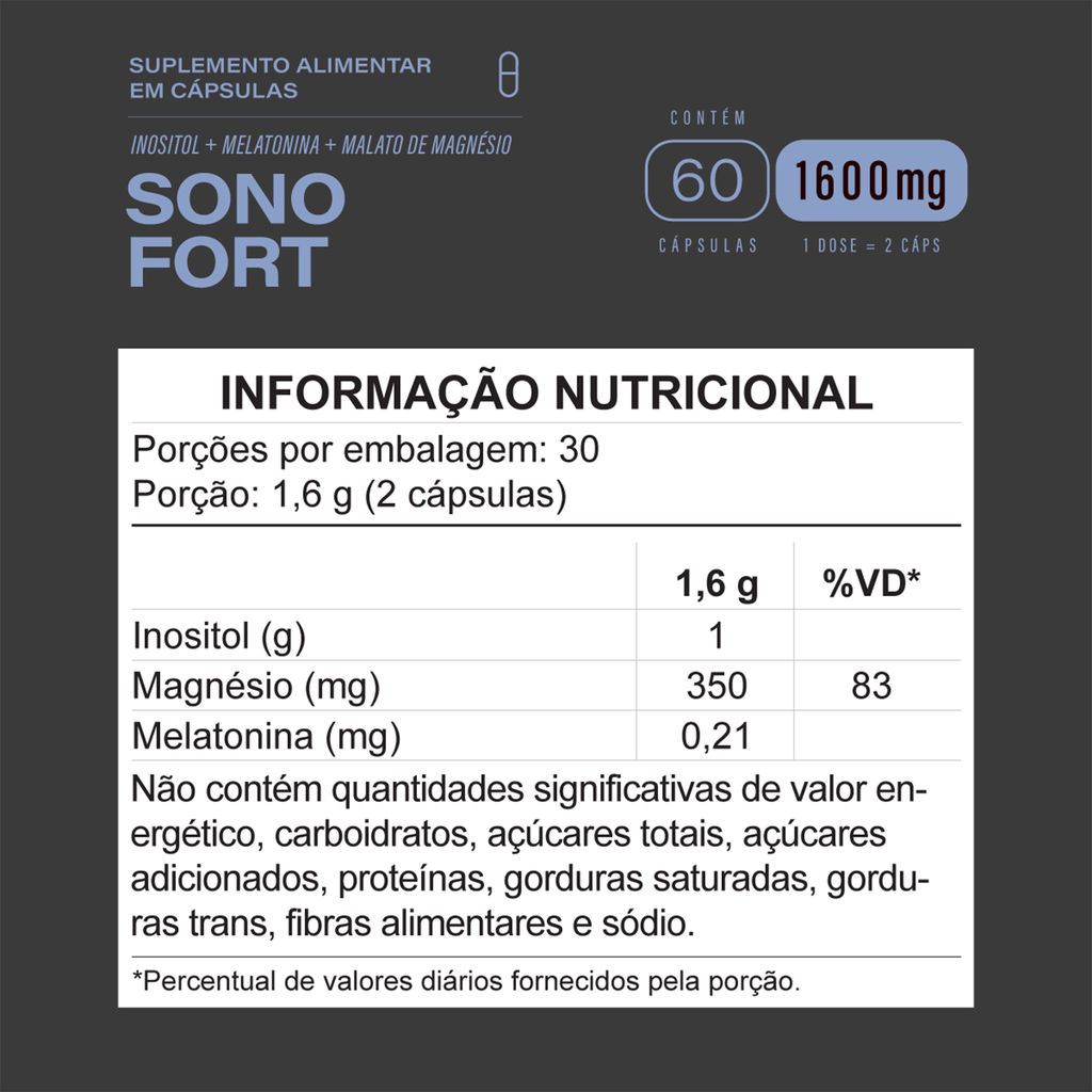 SonoFort é o suplemento desenvolvido para quem busca restaurar a qualidade do sono de forma natural e eficaz. Combinando o alto poder do Inositol ($1000\text{mg}$) com a ação reguladora da Melatonina, este produto é a chave para noites verdadeiramente reparadoras e um despertar cheio de energia.